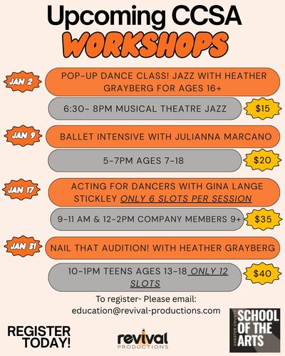 It's cold outside, but it's "Too Darn Hot" in here! Join us for a pop-up dance class with our Artistic Director/Co-Founder, Heather Grayberg! For this 1.5 hour class, students will do 30 minutes of strength and conditioning, 30 minutes of centre/across the floor, and 30 minutes of choreography: "Too Darn Hot" from Kiss Me Kate the musical! Get a jazzy start to 2026 with Heather and the RP/CCSA crew!